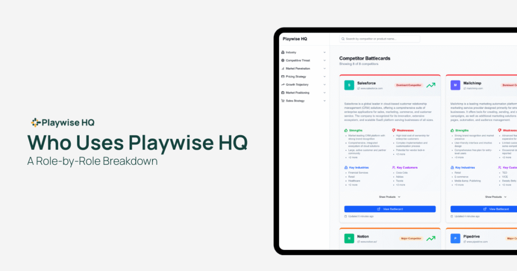 Playwise HQ equips every role in the revenue organization with real-time competitive intelligence, from SDRs qualifying prospects to CROs protecting pipeline. With AI-generated battlecards, live field insights, and dynamic updates, teams replace competitive chaos with sales clarity. Whether you’re defending renewals or closing new business, Playwise HQ ensures your team has the confidence and data to win more deals, faster.